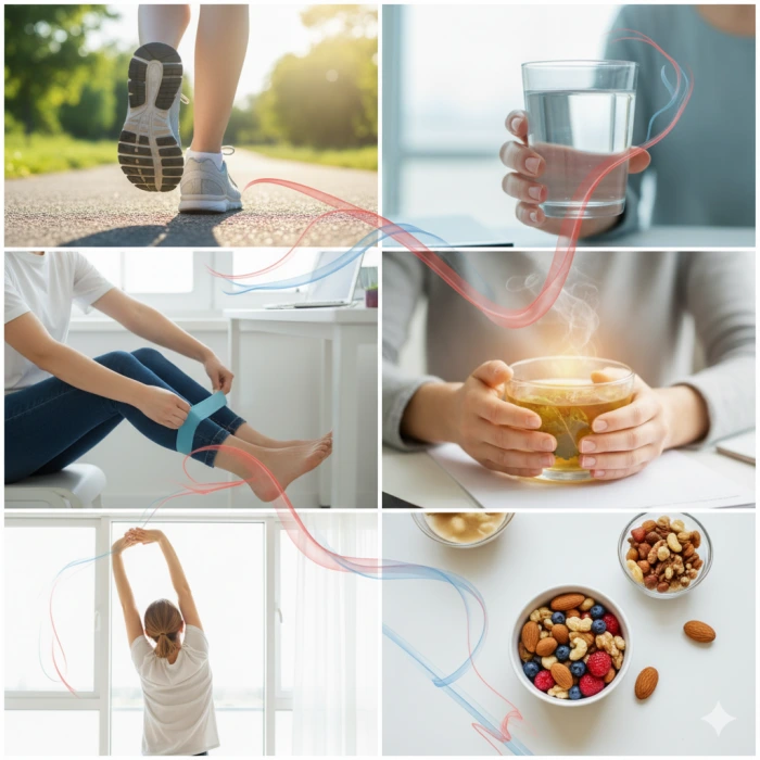 혈액 순환 개선은 결코 하루아침에 이루어지는 마법이 아닙니다. 하지만 매일의 삶 속에 건강한 습관이라는 조약돌을 하나씩 던져 넣을 때, 그 작은 파문이 모여 생명의 강 전체를 움직이는 거대한 물결을 만들어낼 수 있습니다. 다음은 당신의 일상을 재구성할 10가지 구체적인 행동 지침입니다. 1. 기상 후 ‘발목 펌프 운동’으로 아침을 깨워라: 잠에서 깨어 누운 자리에서 발목을 힘차게 까딱거리는 간단한 동작만으로도 밤새 정체되어 있던 하지의 혈액을 심장 쪽으로 되돌려 보내는 강력한 펌프 역할을 합니다. 발끝을 몸 쪽으로 10초간 당겼다가, 바깥쪽으로 10초간 밀어내는 동작을 10회 반복해보세요. 이는 ‘제2의 심장’이라 불리는 종아리 근육을 활성화하여 전신의 혈액 순환을 촉진하는 아침의 첫 번째 스위치가 됩니다. 2. 따뜻한 물 한 잔으로 혈관을 이완시켜라: 아침 공복에 마시는 미지근한 물 한 잔은 탈수 상태의 몸에 수분을 공급하고, 끈적해진 혈액의 농도를 묽게 만들어 혈류를 개선합니다. 또한, 내부 장기의 온도를 높여 혈관을 부드럽게 이완시키고 신진대사를 촉진하는 효과가 있습니다. 3. ‘혈관 청소부’ 오메가-3를 식탁에 올려라: 등푸른생선(고등어, 연어), 들기름, 견과류에 풍부한 오메가-3 지방산은 혈중 중성지방 수치를 낮추고 혈전(피떡) 생성을 억제하여 혈액이 깨끗하고 원활하게 흐르도록 돕는 최고의 식품입니다. 4. 50분 앉았다면 5분은 움직여라: 장시간 앉아있는 자세는 중력의 영향으로 하체 혈액 순환에 최악의 환경을 제공합니다. 알람을 맞춰두고 최소 1시간에 한 번은 일어나서 제자리 걷기를 하거나 가벼운 스트레칭으로 다리 근육을 수축, 이완시켜 혈액이 고이는 것을 막아야 합니다. 5. 다리 꼬는 습관과 작별하라: 다리를 꼬는 자세는 한쪽 다리의 정맥과 동맥을 직접적으로 압박하여 혈액의 흐름을 물리적으로 방해하고, 장기적으로는 골반 불균형까지 초래할 수 있는 매우 나쁜 습관입니다. 6. 계피와 생강을 가까이하라: 계피는 말초 혈관을 확장시켜 손발까지 따뜻한 혈액이 도달하도록 돕고, 생강의 진저롤 성분은 혈액 순환을 촉진하고 몸을 따뜻하게 만드는 효과가 탁월합니다. 따뜻한 차 형태로 꾸준히 섭취하면 좋습니다. 7. 잠들기 전 ‘L자 다리’로 하루의 피로를 풀어라: 벽에 엉덩이를 붙이고 누워 다리를 벽에 기대어 올리는 간단한 자세만으로도 하루 종일 다리에 쏠려있던 혈액과 림프액이 중력의 도움을 받아 심장 쪽으로 원활하게 되돌아올 수 있습니다. 10~15분간 유지하면 다리의 부종과 피로를 해소하는 데 매우 효과적입니다. 8. 꽉 끼는 옷 대신 편안한 옷을 선택하라: 스키니진이나 보정 속옷처럼 몸을 과도하게 압박하는 의상은 혈관을 좁게 만들어 혈액 순환을 방해하는 직접적인 원인이 될 수 있습니다. 특히 복부나 하체를 조이는 옷은 피하는 것이 좋습니다. 9. 심장보다 높게, 다리 베개를 활용하라: 수면 시 발아래에 낮은 베개나 쿠션을 받쳐 다리를 심장보다 약간 높은 위치에 두는 것은 수면 시간 내내 정맥혈의 회귀를 도와 다음 날 아침 한결 가벼운 다리를 만들어 줍니다. 10. 웃음과 심호흡으로 스트레스를 관리하라: 스트레스는 혈관을 수축시키는 코르티솔 호르몬을 분비시킵니다. 반면, 크게 웃는 행위는 혈관 내피세포를 이완시키고, 깊은 복식 호흡은 부교감신경을 활성화하여 혈관을 확장하고 혈압을 안정시키는 효과가 있습니다.